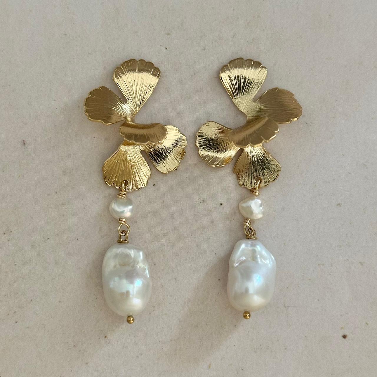 Aros de perla natural barroca, bañados en oro de 24 kilates por artesanos de Chanel.